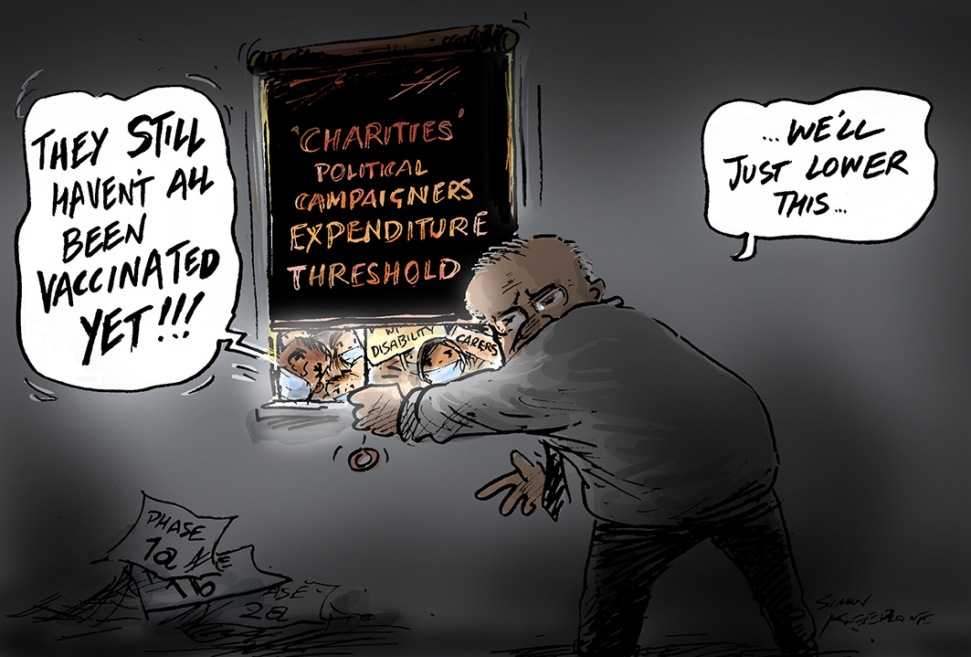 ‘Charities are deeply concerned by a new government proposal that would force more community groups to register as political campaigners, amid fears this will restrict charitable advocacy at election times’. The Morrison government has introduced a new bill to lower the expenditure threshold for political campaigners from $500,000 to $100,000. This week’s Pro Bono news cartoon.