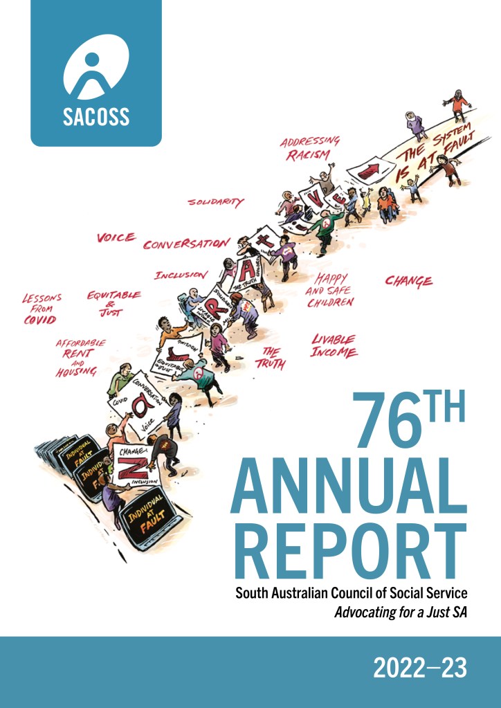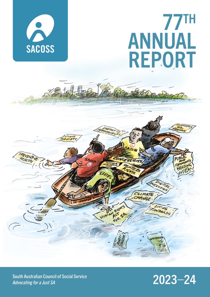 Cover illustration for the South Australian Council of Social Service SACOSS annual report. The community sector is at a crossroads…