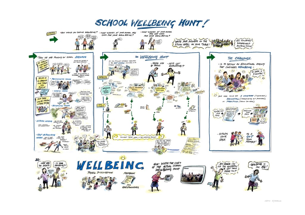 A graphic recording of the Queensland University of Technology – Centre for Inclusive Education’s Wellbeing Hunt – a day of school students assessing their school for student wellbeing, then considering what could be done at their school to improve students’ wellbeing.