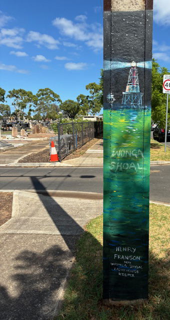The Cheltenham Cemetery Stobie Pole Project is engaging artists to paint the sides of stobie poles adjacent to the Cheltenham Cemetery with themes reflecting local history and figures buried in the cemetery. I have painted two sides.