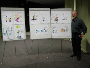 Below are some examples of cartoons done at conferences and workshops. Thanks to Sofiah Mackay for her photographs from the recent third and final Story Conference. The NECMA Day pictures were drawn for the workshop invitations.