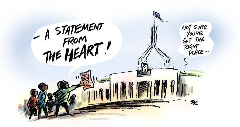 The newly elected Prime Minister Anthony Albanese has promised that the Labor government will commit “in full” to the Uluru Statement from the Heart, which since 2017, has been calling for a First Nations voice to parliament enshrined in the constitution. To assert his voice, setting out a plan of action on the Statement, Parry Agius proposed a series of social media posts leading up to last Saturday’s federal election. We worked together on these cartoons to illustrate Parry’s thoughts.