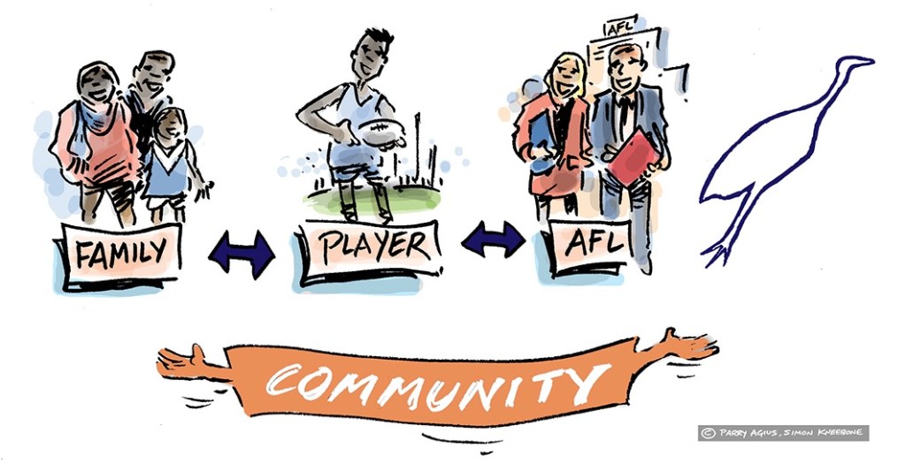 Illustrations created in collaboration with Parry Agius, Linking Futures, for Star Dreaming -holistic athlete development. The dark emu image is used in each picture. These graphics illustrate preparing indigenous players for the Australian Football League AFL – which involves much more than just the player…
